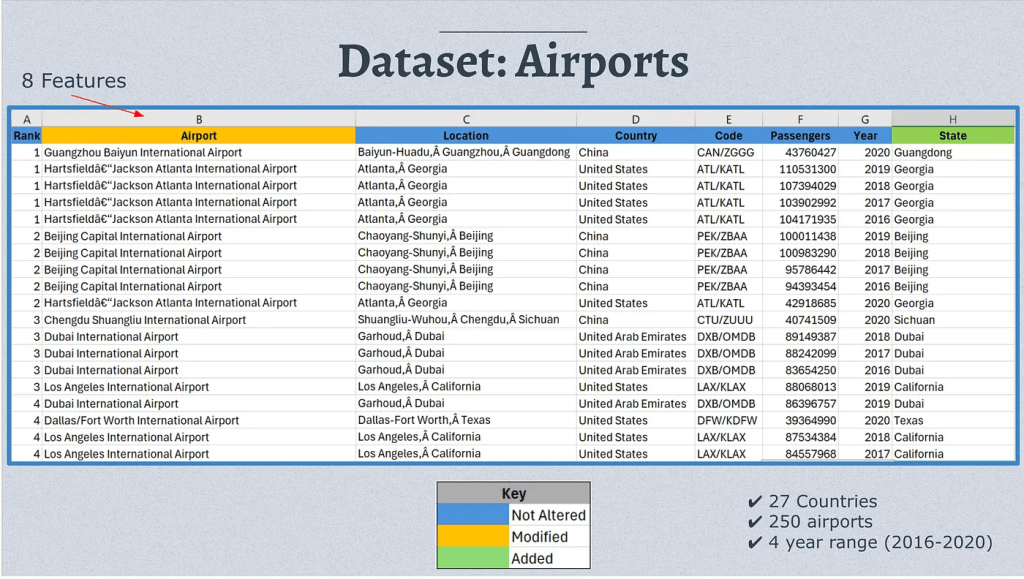 In order to provide a clear reasoning and a compelling persuation, we first start from the step of data cleaning. One of our first task was to extract some features out of the dataset, namely the State/Province that each airport was in. This was done using a bit of string manipulation on the ‘Location’ field. The second thing we had to do was edit all the Airport names. Initially, all airport names had the country names prepended to airport names which was redundant — since we already have a separate field ‘Country’ — and made the already long airport names, even longer. Thus, we removed the prepended country names from the airport names for each airport.