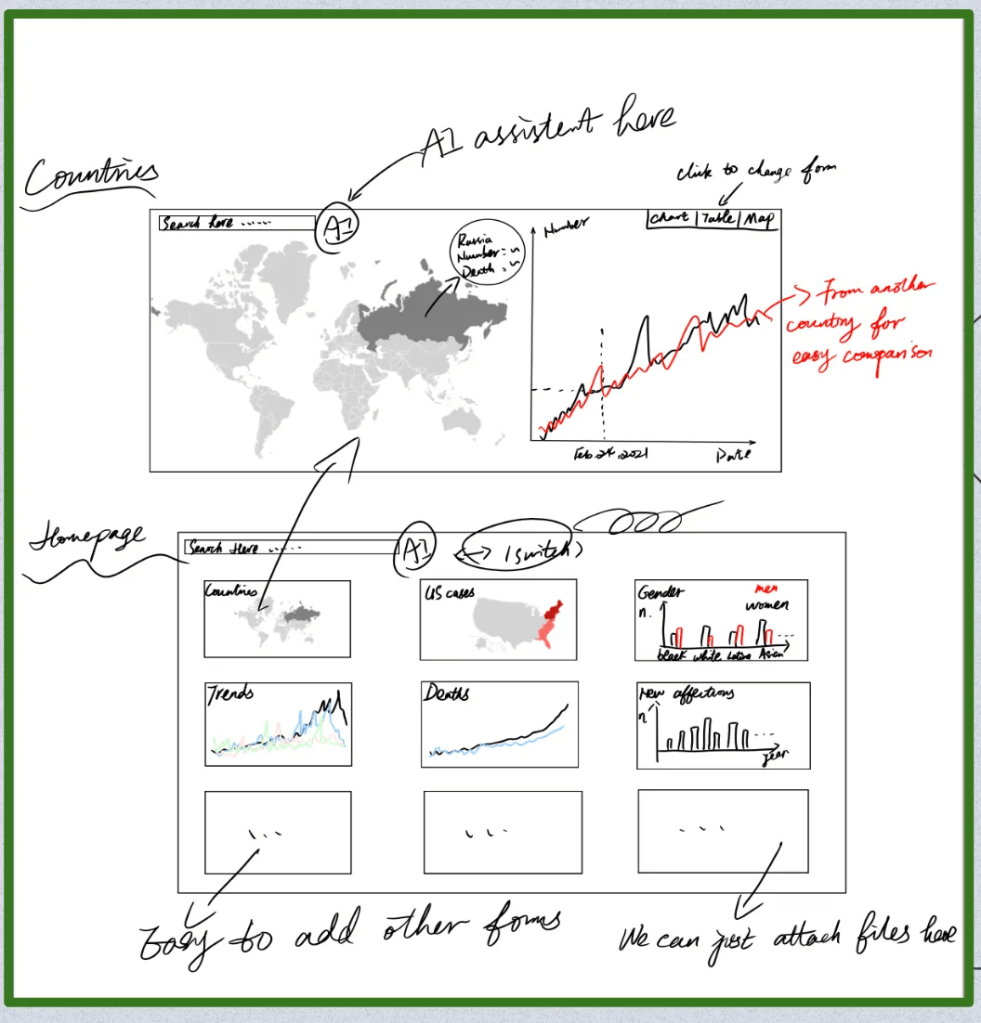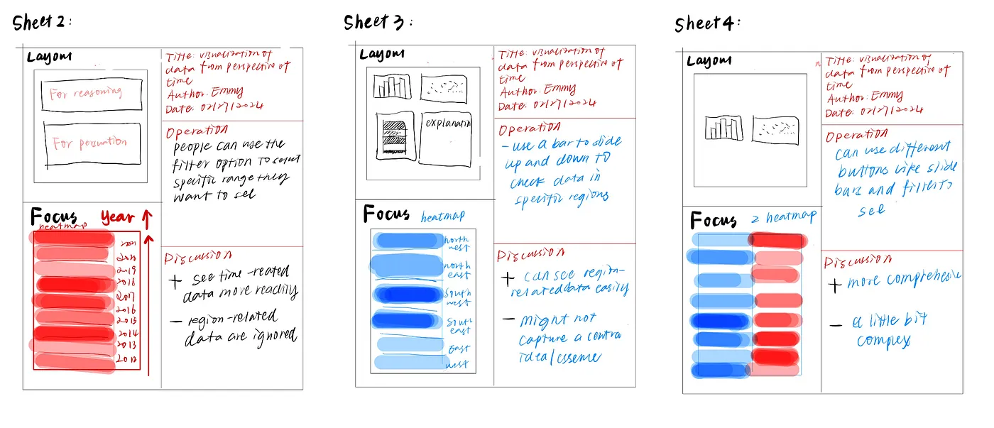 Then, in the following 2–4 stages, we recorded three ideas from the intial brain-stroming phases. In this process, we intend to achieve two purposes: communication and persuasion, through the process of creating spatial and temporal visualizations. For instance, initially, we found we might employ map charts to reason the data from a geographic perspective. Employing map charts would enable the audience to see specific clusters and geographical trends from a holistic perspective, thus increasing their understanding of airport data.