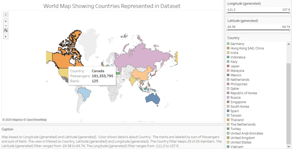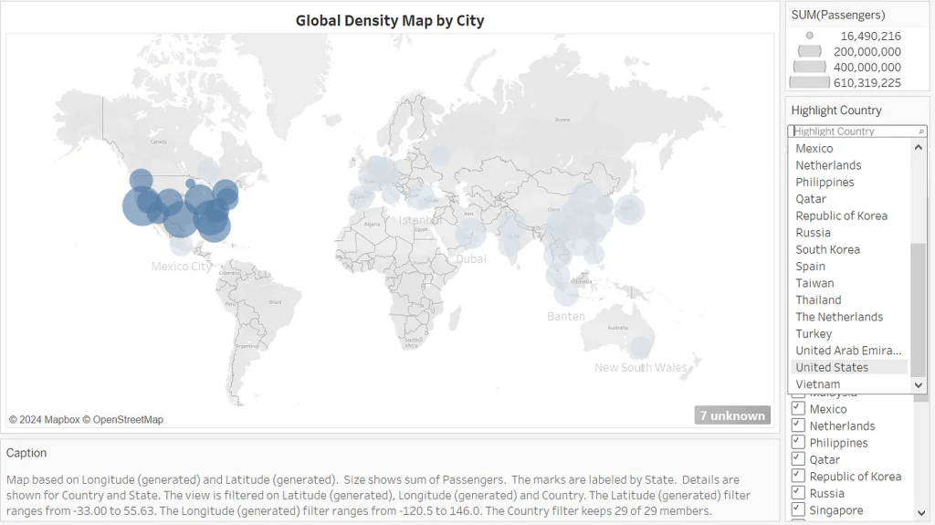 Second, we were inspired by the former map chart and decided to provide a specific map chart for presenting the density of passengers around the world, showing the users the geographical clusters of flights and passengers. In this map, the filter bars on the right side allow the users to select specific countries or regions to check the clustered region, thus obtaining a direct observation of the density region with a large number of passengers across the world.