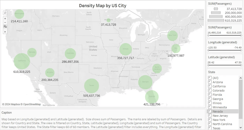 Third, in our visualization, we aim to provide not only a grand picture but also detailed and specific spatial visualizations. Therefore, we create a density map by US City, in which the user would be able to compare the density of passengers between the northwestern and southern US by changing the longitude and latitude slide bars, filtering the data according to the level of crowdedness by choosing a specific range in the SUM slide bar, etc.