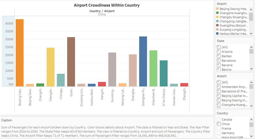 In our project of visualization, we decided to employ the dataset of “Most Crowded Airports” discovered on Kaggle, a professional website for users to find specific datasets in various topics. In this dataset, we can take an overview of the most crowded airports between 2016 and 2020, involving data related to 27 countries with a world-wide span, states and regions, cities, 250 airports, passenger numbers, and a 4-year range. There are two reasons to choose this specific dataset. First, although the number of countries is not tremendous, the span of the country is international compared to a lot of datasets that focus on specific continents; therefore, such a grand geographical span would allow us to present a more comprehensive visualization for a large potential audience. Second, this content in this data would allow us to explore assorted questions from different perspectives, such as “Which country has the most crowded airports?” and “Which year had the most passengers?” thus presenting more information on air-related topics to the audience.
