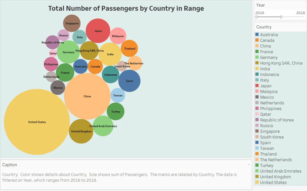 Then, we decide to build temporal visualizations to present specific aspects of this dateset. First, we build a bubble chart, a chart that displays multiple circles in a two-dimensional plot, to show the total number of passengers by country. In this chart, through interacting with the filter to choose a specific year and country, the users would be able to compare and contrast the change in passenger numbers among countries through time, thus knowing the development of passenger numbers in a comparative way.