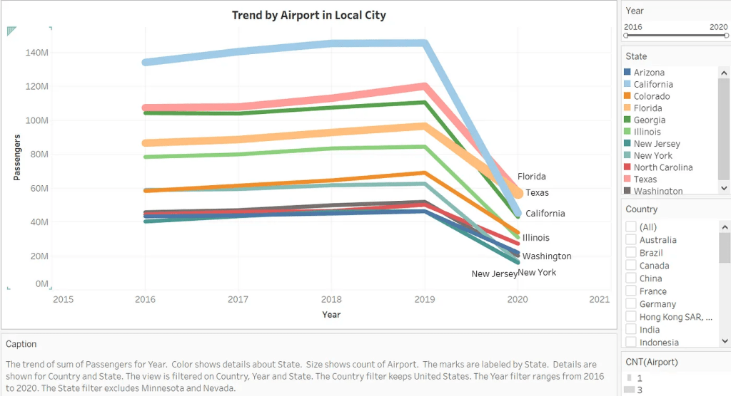 In addition, we employ a line chart to present the trend of the number of passengers in specific cities, allowing users to compare both short-term and long-term changes. This chart enables us to provide more profound insights to a potential audience, conveying a persuasive perspective. To be specific, this chart compares the trend among several states in the United States. We can clearly perceive from the chart that from 2016–2019, the lines are in a slight increasing manner, meaning the passengers in these states are increasing. However, from the period of 2019 to 2020, there has been a steep decrease in all states; the state with the deepest decrease here is California. This chart might imply a story beyond air data; this chart could become one of the potential evidences of COVID-19’s impact on people’s lives. Since the pervasiveness of COVID-19, many activities are restricted, including flights. Therefore, the decrease proves COVID’s negative effect on the number of passengers, especially in California, which has a lot of international and domestic flights.
