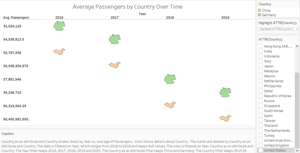 Third, we made a visualization to present average passengers over time among countries for users to compare and contrast. For instance, in this chart, the user chose to compare China and Germany’s average passengers from 2016–2019, showing that China tends to have more passengers through time on average.