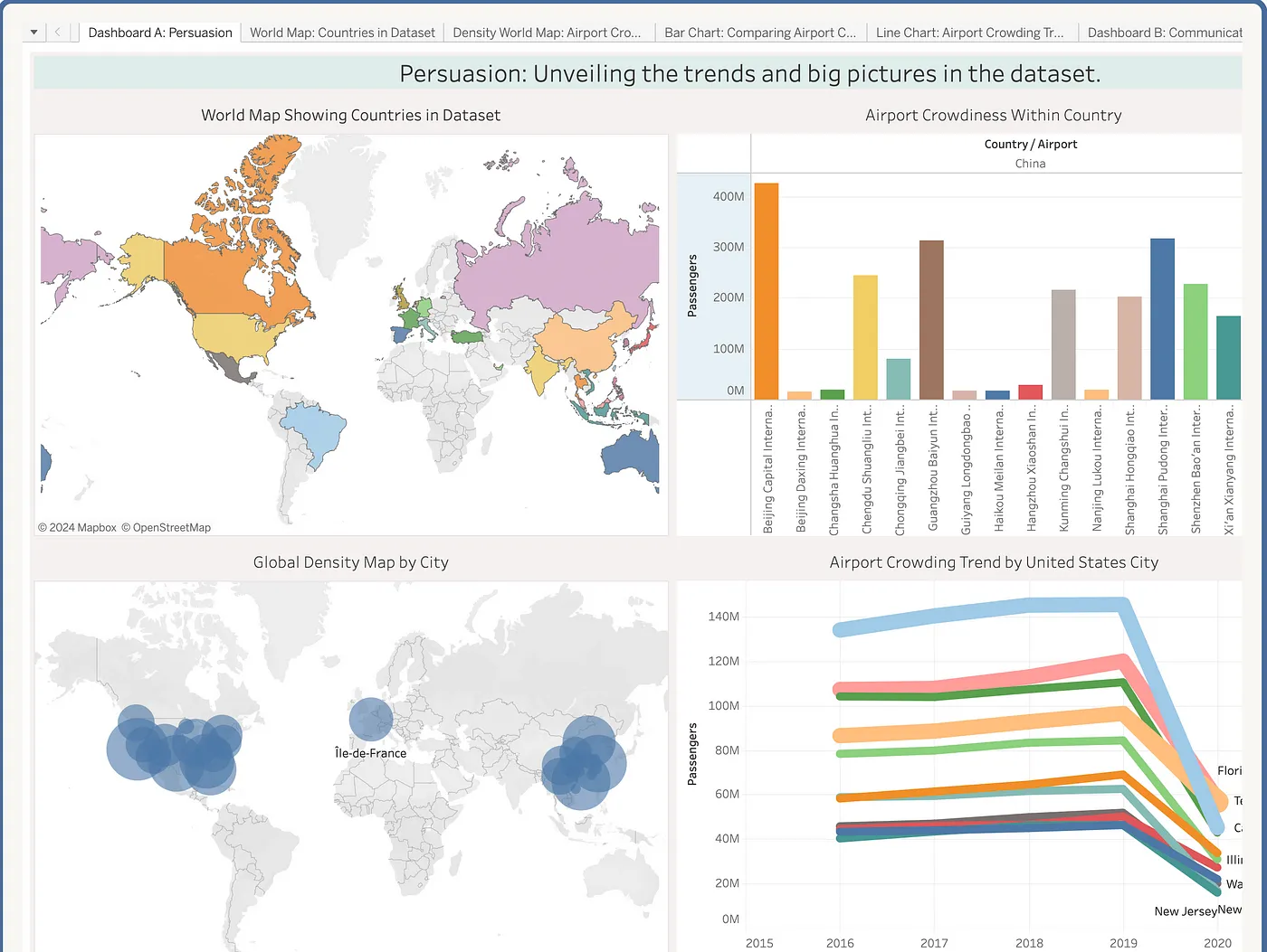 In the end, we integrate our visualizations into two dashboards to achieve our two purposes: 1) clear communication and reasoning, and 2) persuasive communication and storytelling. In the first dashboard, we achieve the purpose of persuasion by introducing the spatial distribution of this dataset, global density, and regional airport density for users to plan their own flights more readily, and we allow passengers to read the data in a more in-depth way, enabling them to connect airport data with more topics such as pendamics in the current interlocking world. In the second dashboard, we achieve the purpose of communication by allowing the users to take assorted perspectives during the reasoning process, thus having more comprehensive insights into the passengers in a world-wide range and at different timestamps.