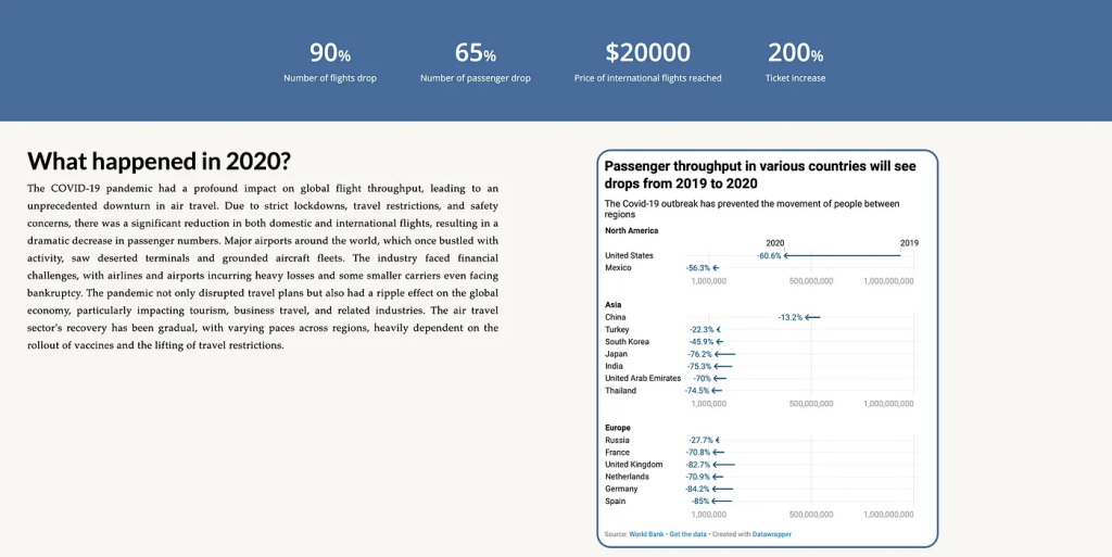 In addition, we provide a section on “What happened in 2020?” correlating to our prior line chart visualization, illustrating the impact of COVID-19 on airports.
