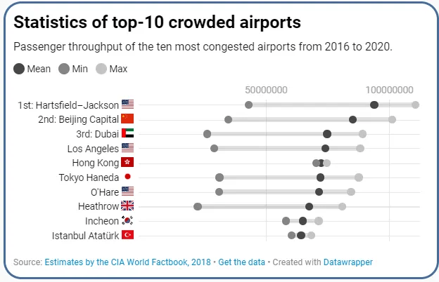The dataset we chose is “Crowded Airports”, in which it depicted countries across continents and the airports’ passenger density statistics within countries from 2016 to 2020. Based on the dataset, we made bar plots, dot plots, and density plot from both the temporal and spatial perspective to embody the density of airports within countries, between countries, and among continents.