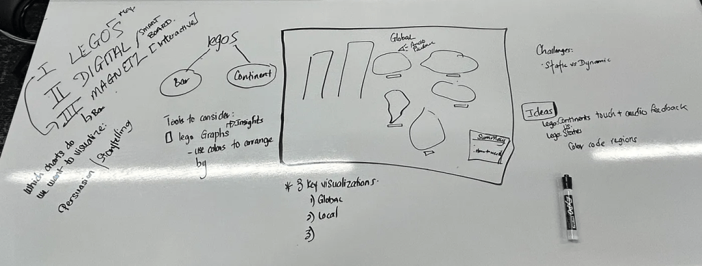 From the perspective of kinesthetics, we decided to enable the users to use their hands or other body parts to feel the data. Therefore, we chose Lego bricks to create since stacking Lego bricks together can create various textures, just like braille, so people who have visual impairments can feel the heights and textures more readily to feel the airport density of specific regions.