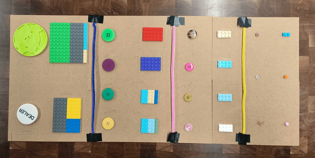 In the prototype 3, we decided to employ buttons and Lego bricks to provide both visual and kinesthetic visualizations. To be specific, we translated the bubble chart which represents the density of airports in each country by various sizes from a pure visual presentation to a multimodal presentation that can both visual and touchable information. In this prototype, we employ different sizes of buttons to represent the airport density of a specific country, and coordinately, we set up a comparable size of Lego bricks beside the buttons for people who have visual impairments to touch and feel and compare the density of the airports.